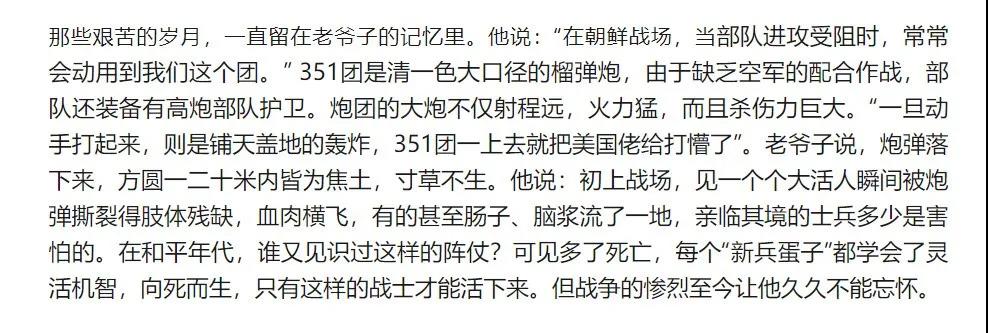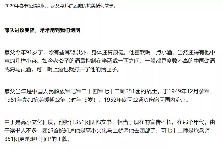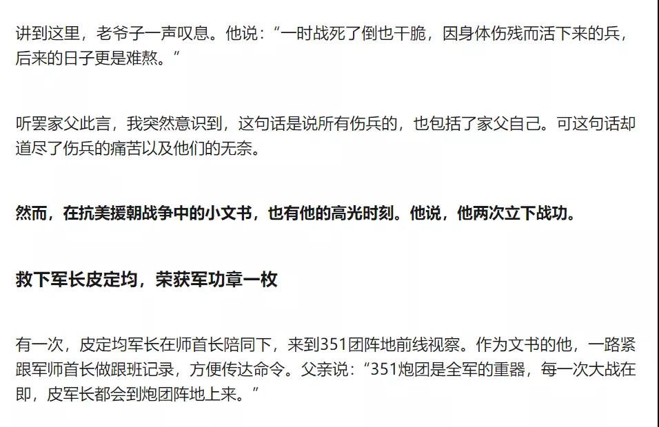 這幾天,我也時(shí)??吹礁鞔笃脚_(tái),各微信群里,關(guān)于這場(chǎng)戰(zhàn)役的評(píng)說(shuō)和討論,還有抗美援朝的幸存者老兵們的各種回憶,其中有一個(gè)朋友 ,他的父親是這場(chǎng)戰(zhàn)役的參與者,是這個(gè)炮兵團(tuán)的一個(gè)文書,上火線,救首長(zhǎng),送情報(bào),闖封鎖,朋友為他父親寫下一篇記錄,我認(rèn)認(rèn)真真的看了幾遍,感觸更深!